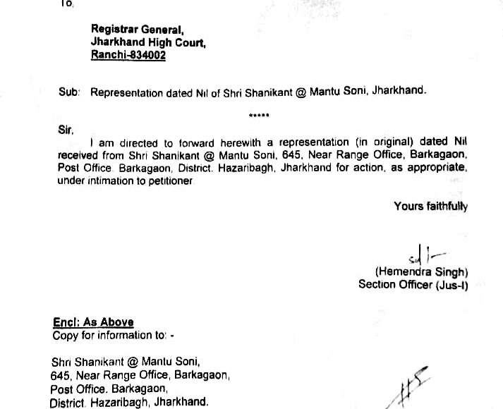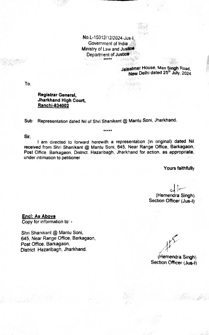 रांची सिविल कोर्ट के एडीजे 7 के खिलाफ शिकायत पर रजिस्ट्रार जनरल को आवश्यक कार्रवाई हेतु पत्र By News7 Air On Aug 16, 2024 Ranchi: डिपार्टमेंट ऑफ जस्टिस,भारत सरकार ने रांची सिविल कोर्ट के एडीजे 7 के खिलाफ शिकायत पर रजिस्ट्रार जनरल को आवश्यक कार्रवाई करते हुए शिकायत को सूचित करने हेतु पत्र लिखा है। Share