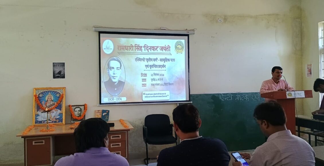 Ranchi: हिंदी विभाग, झारखंड केंद्रीय विश्वविद्यालय में राष्ट्रकवि रामधारी सिंह दिनकर की जयंती मनाई गई। सबसे पहले दीप प्रज्ज्वलित कर कार्यक्रम की शुरुआत की गई। तत्पश्चात साहित्य अकादमी द्वारा निर्मित दिनकर के जीवन से संबंधित वृत्तचित्र प्रस्तुत किया गया। विभागाध्यक्ष प्रोफेसर रत्नेश विष्वक्सेन ने अध्यक्षीय वक्तव्य देते हुए दिनकर के वीर काव्य प्रसंगों से हटकर ‘उर्वशी’ के संदर्भ में मनुष्य के सनातन द्वंद्व को रेखांकित करते हुए उसके कुछ अंशों का मर्मस्पर्शी पाठ किया। अपने वक्तव्य में सहायक प्राध्यापक डॉ उपेंद्र कुमार ने कहा कि दिनकर पहले जनकवि हैं फिर राष्ट्रकवि। इसके बाद विद्यार्थियों शोधार्थियों द्वारा काव्यांजलि अर्पित करते हुए उनकी कुछ कविताओं का पाठ किया गया। स्नातक की छात्राओं ने रश्मिरथी तृतीय सर्ग (कृष्ण की चेतावनी) का सामूहिक पाठ किया। आदर्श सौरभ ने ‘वसंत के नाम पर’ , कल्याणी ने ‘कलम आज उनकी जय बोल’ , रूपेश ने ‘सिंहासन खाली करो की जनता आती है’ तथा शोधार्थी रूमा ने ‘आग की भीख’ एवं अंशु ने ‘हिमालय’ कविता का पाठ किया। शोधार्थी चंदन कुमार सिंह ने ‘वीर काव्य परंपरा में परशुराम की प्रतीक्षा और उसके अंतर्निहित तत्व’ शीर्षक से अपना शोध पत्र प्रस्तुत किया। कार्यक्रम का संचालन शोधार्थी मनीष दुबे ने तथा धन्यवाद ज्ञापन सुनीता कच्छप ने किया।