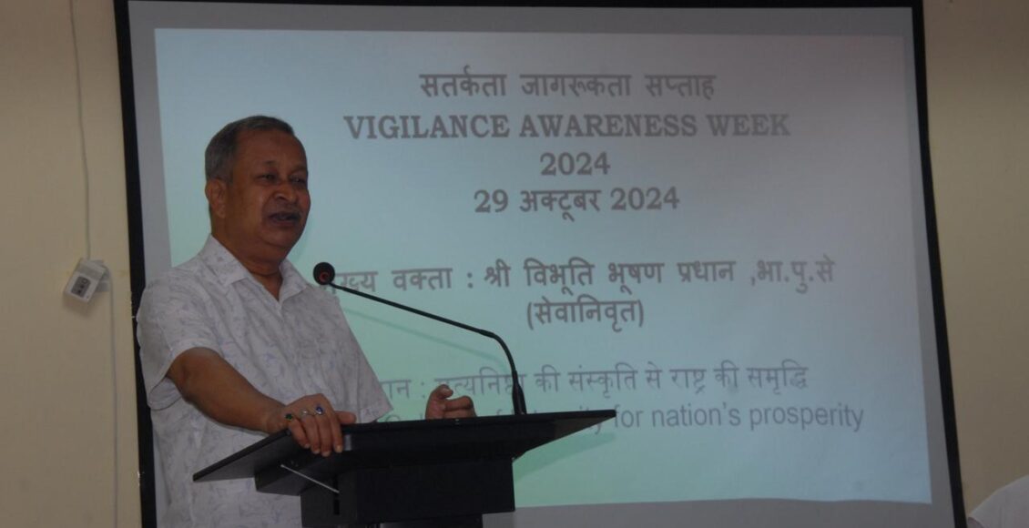 कार्यक्रम का मुख्य विषय “सत्यनिष्ठा की संस्कृति से राष्ट्र की समृद्धि” था। कार्यक्रम में मुख्य अतिथि के रूप में सेवानिवृत्त आईपीएस अधिकारी श्री विभूति भूषण प्रधान उपस्थित रहे। सबसे पहले संस्थान के निदेशक ने मुख्य अतिथि को पुष्पगुच्छ देकर सम्मानित किया और इस सप्ताह की महत्ता पर संक्षिप्त भाषण दिया। निदेशक महोदय ने कहा कि सतर्कता सप्ताह हमें हमारे दायित्वों और अनियमितताओं से बचने के महत्व का पुनः स्मरण कराता है।