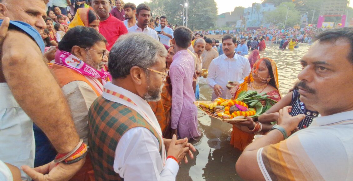 BJP state chief and former chief minister Babulal Marandi accompanied by his party executive president Ravindra Roy offered Arghya to setting sun on the third day of four-day chhath festival at Rajdhanwar, one of 81 parliamentary constituencies of Jharkhand from Marandi is a candidate.