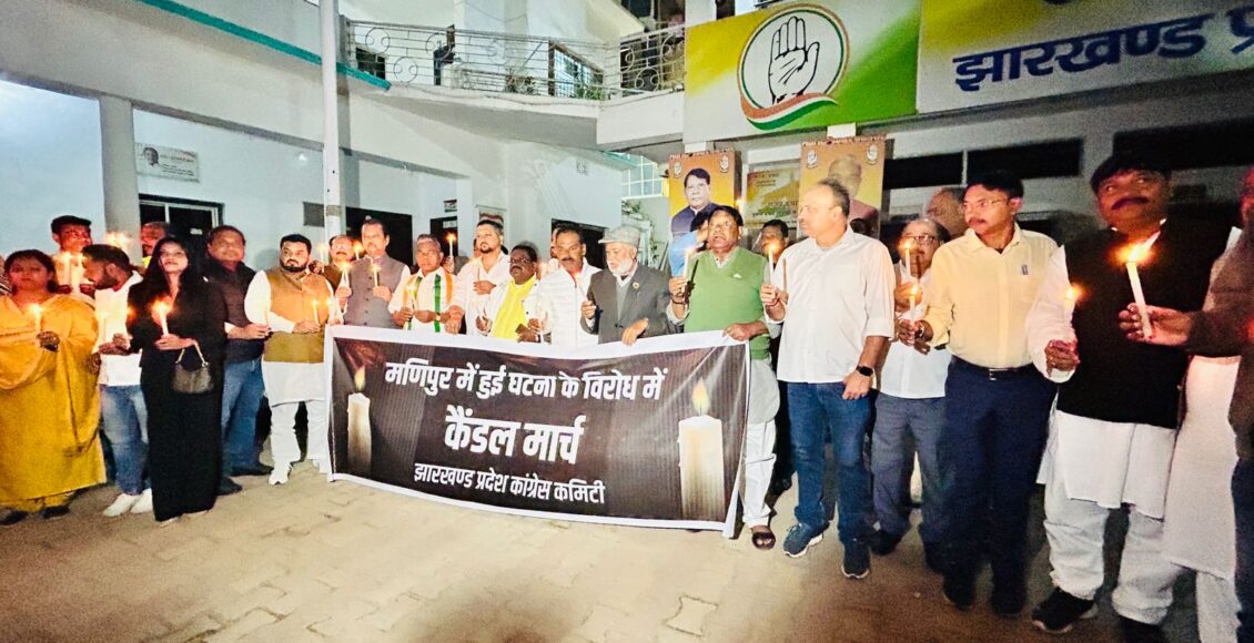 रांची: मणिपुर में डेढ़ साल से अधिक समय से जारी हिंसा के विरोध में कांग्रेस पार्टी के कार्यकर्ताओं ने सोमवार को पार्टी कार्यालय से कैंडल मार्च निकाला।