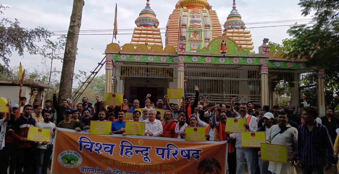 रांची: विश्व हिंदू परिषद झारखण्ड प्रांत द्वारा रांची के रेलवे स्टेशन, बगलामुखी हनुमान मंदिर में विरोध प्रदर्शन किया गया। विहिप झारखण्ड प्रांत के मंत्री मिथिलेश्वर मिश्र ने बांग्लादेश प्रशासन द्वारा वहां के इस्कॉन मंदिर के मुख्य पुजारी की गिरफ्तारी पर चिंता व्यक्त करते हुए उसे वहाँ के प्रशासन की कायरता पूर्ण और अलोकतांत्रिक घटना बताया है। बजरंग दल प्रांत संयोजक रंगनाथ महतो ने कहा कि बंगला देश तत्कालीन सरकार के इस कायरता पूर्ण और अलोकतांत्रिक घटना का पुरजोर विरोध करती है।