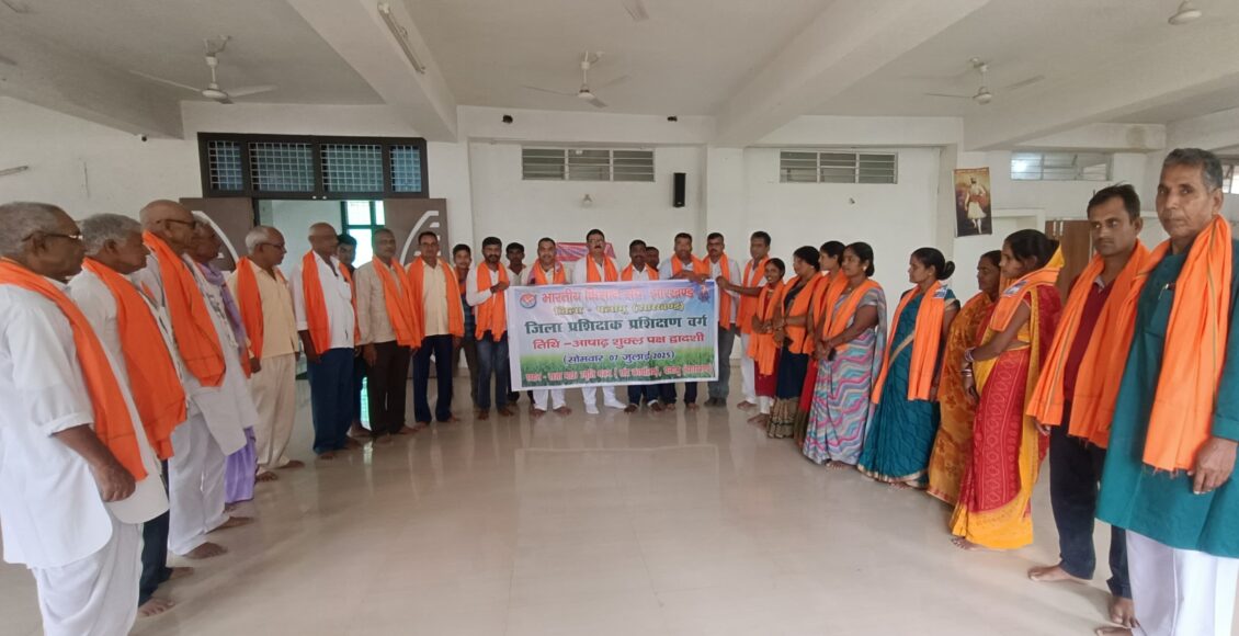 मेदिनीनगर/नीलाम्बर पीताम्बरपुर, पलामू: राष्ट्रीय स्वयंसेवक संघ (आरएसएस) के जिला मुख्यालय में आज भारतीय किसान संघ से जुड़े कार्यकर्ताओं का एक विशेष प्रशिक्षण कार्यक्रम आयोजित किया गया। इस एकदिवसीय प्रशिक्षण शिविर में जिले से आए लगभग 100 किसान कार्यकर्ताओं ने भाग लिया। कार्यक्रम का उद्देश्य किसान आंदोलन की दिशा, देश की कृषि नीति में राष्ट्रीय स्वाभिमान का समावेश और गांव आधारित अर्थव्यवस्था को मजबूत करने की रणनीति पर मंथन करना था।