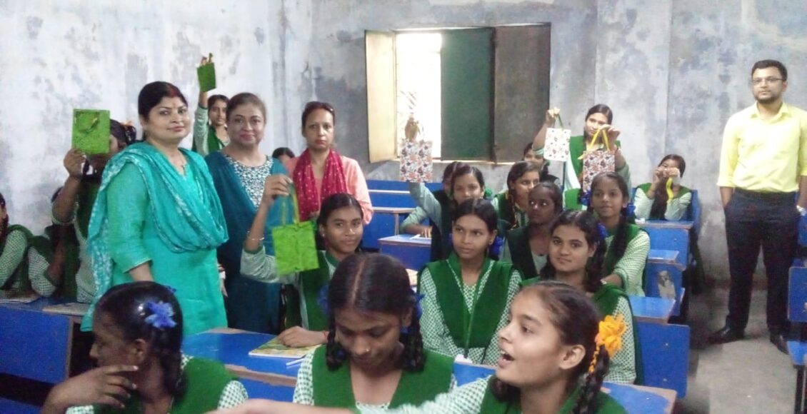 The workshop started with distribution of handmade papers, fevicol, colourful satin ribbons. Chairperson Arti Sahuliyar and treasurer Hazel Davis guided students to design paper bags which brought smiles on their faces. In this one hour workshop all students skillfully designed paper bags and displayed them in the classroom. In the coming days this workshop will be conducted in other such schools and slum areas.