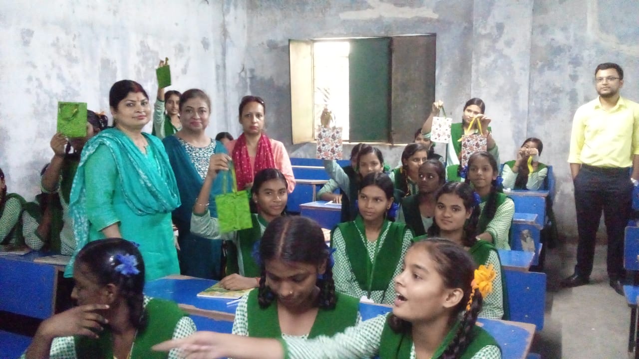 The workshop started with distribution of handmade papers, fevicol, colourful satin ribbons. Chairperson Arti Sahuliyar and treasurer Hazel Davis guided students to design paper bags which brought smiles on their faces. In this one hour workshop all students skillfully designed paper bags and displayed them in the classroom. In the coming days this workshop will be conducted in other such schools and slum areas.