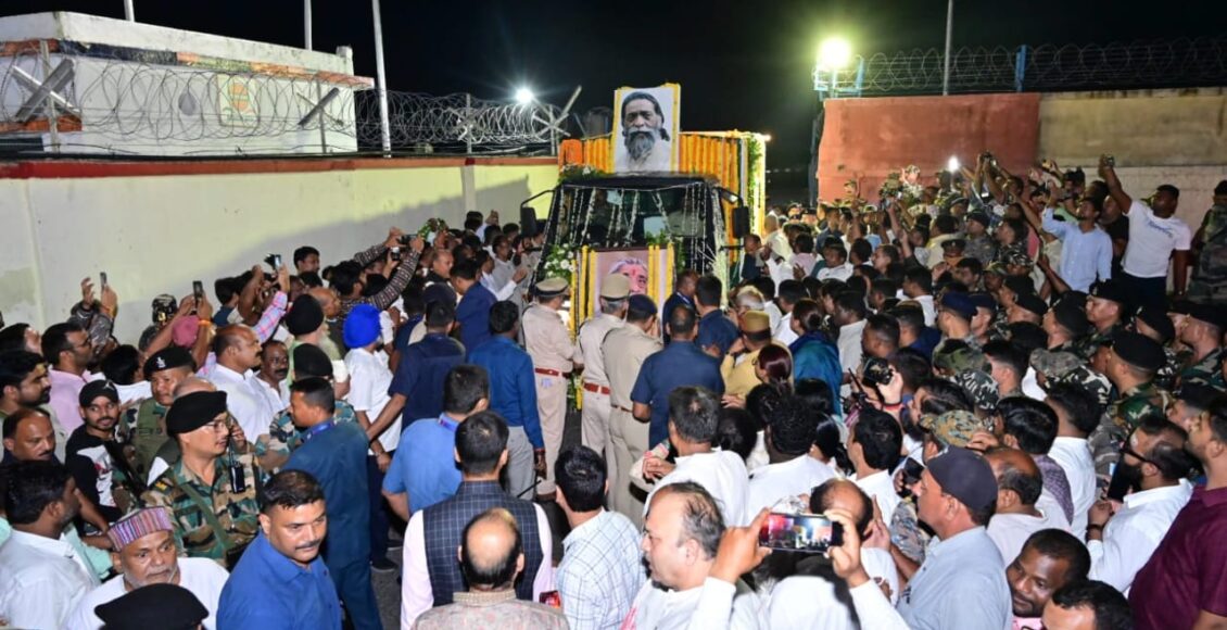 रांची : दिशोम गुरु शिबू सोरेन का पार्थिव शरीर रांची के बिरसा मुंडा एयरपोर्ट से उनके सरकारी आवास मोरहाबादी के लिए ले जाया जा रहा है। सोमवार को शाम 6:40 बजे उनका पार्थिव शरीर रांची पहुंचा। बिरसा मुंडा एयरपोर्ट पर जैसे ही उनके विमान की लैंडिंग हुई, पूरा एयरपोर्ट इलाका शिबू सोरेन अमर रहे के नारे से गूंज उठा। पुराने टर्मिनल भवन के पोर्टिको में उनको श्रद्धांजलि देने के लिए विशेष रूप से तैयार किया गया था।