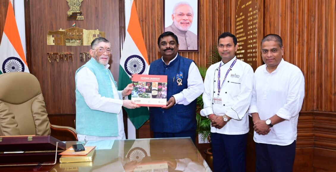 Ranchi, October 3:In a distinguished courtesy call, Dr. Bhupesh Kumar, Principal of the Institute of Hotel Management (IHM), Ranchi, along with Chef Rajneesh Singh and Mr. Praveen Raman, met Hon’ble Governor of Jharkhand, Shri Santosh Gangwar. On this occasion, Dr. Kumar presented the institute’s extraordinary coffee table book “Savoring Jharkhand: A Culinary Journey of Indigenous Flavours” to the Hon’ble Governor.